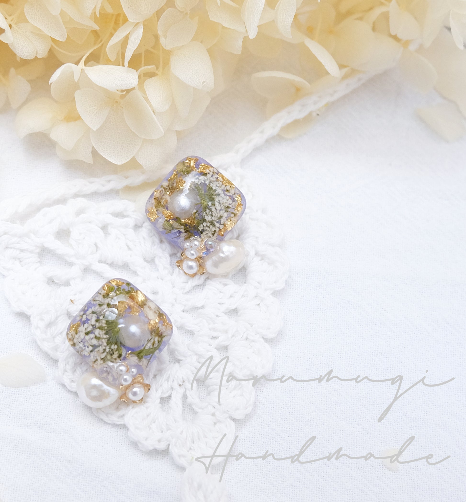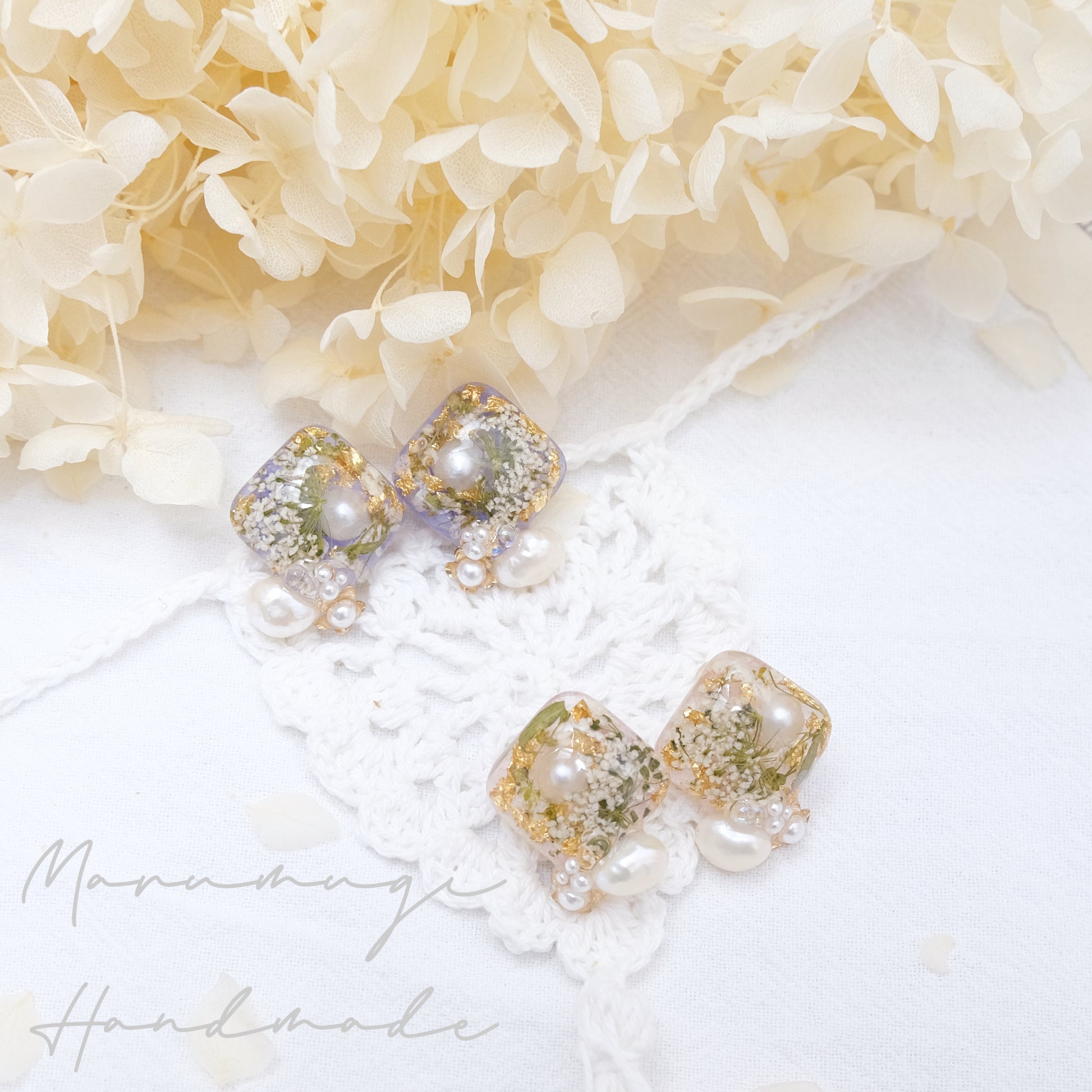 ドライフラワー、金箔、淡水パール、レジン、SV925製ピアスポスト