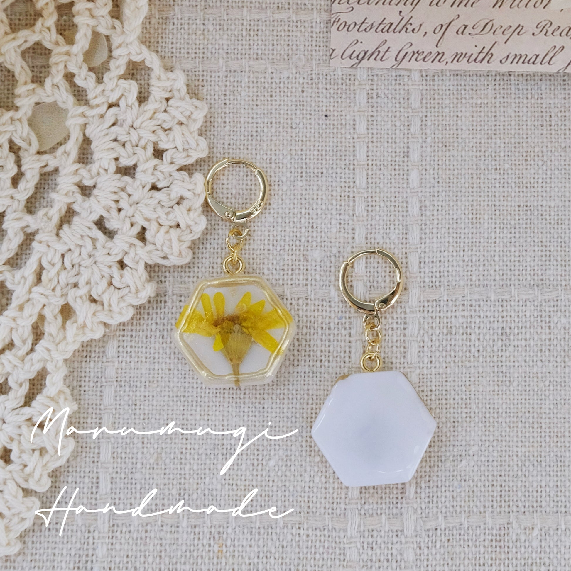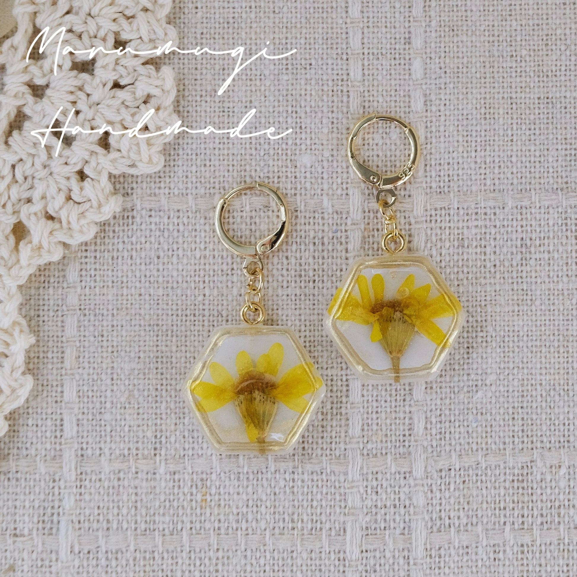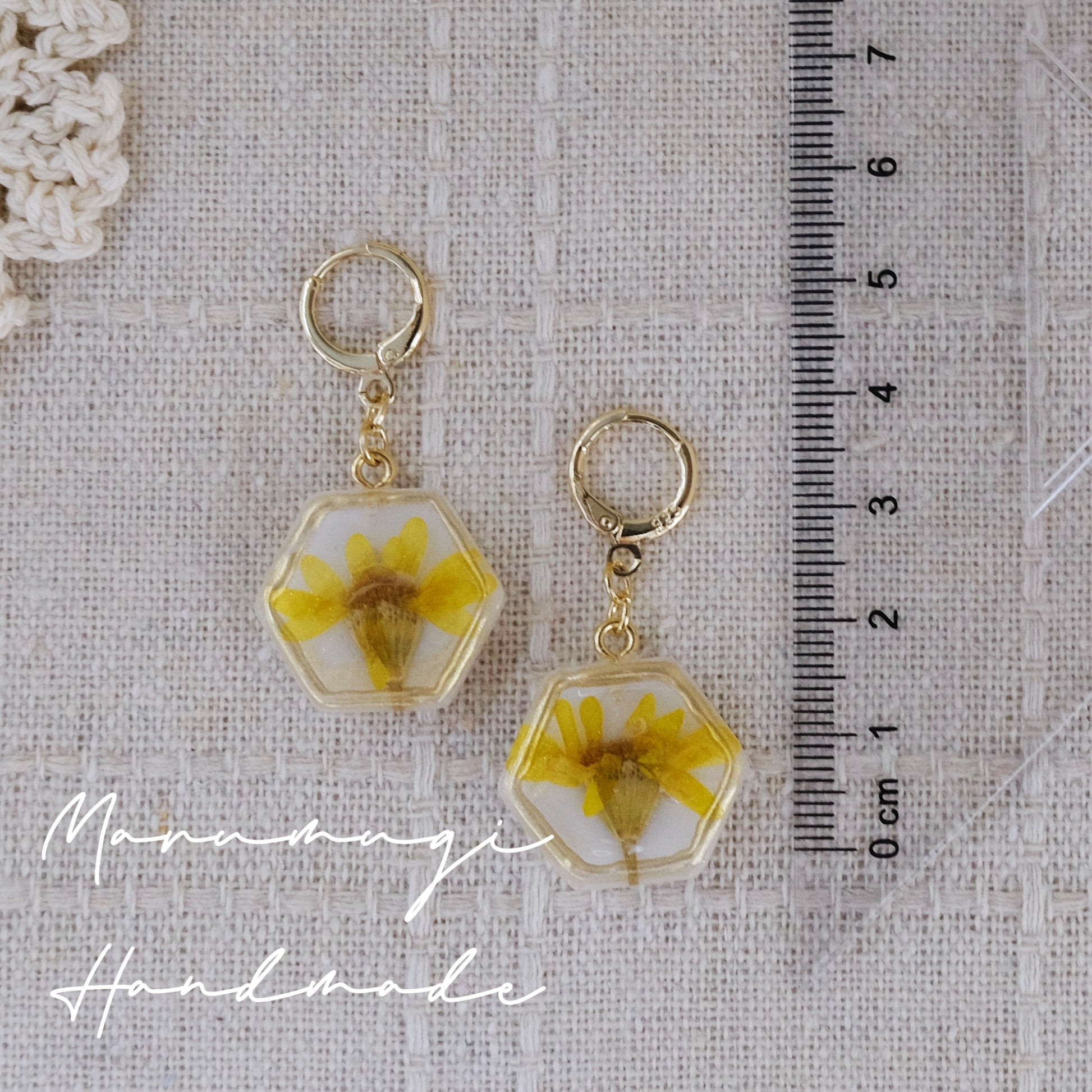 六角形のフレームに黄色の小さな雛菊を閉じ込めた、可愛らしいピアスです。