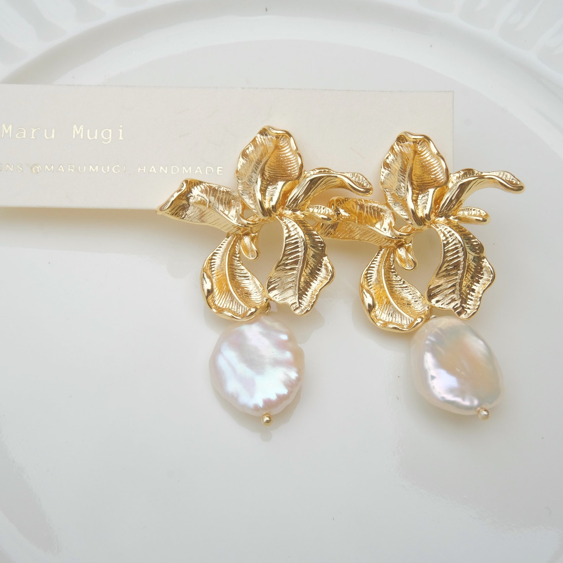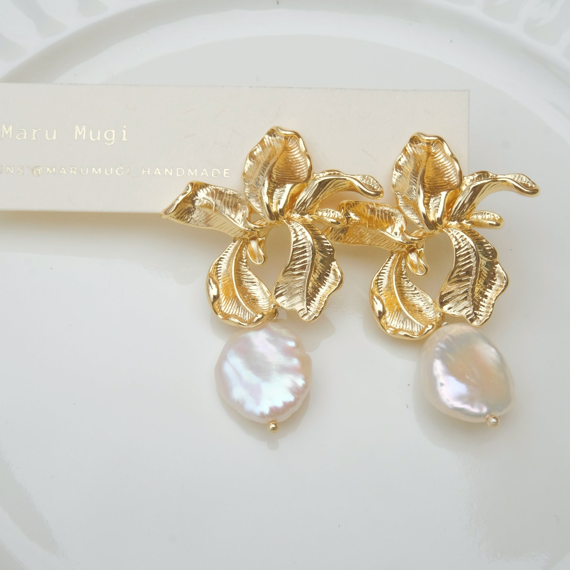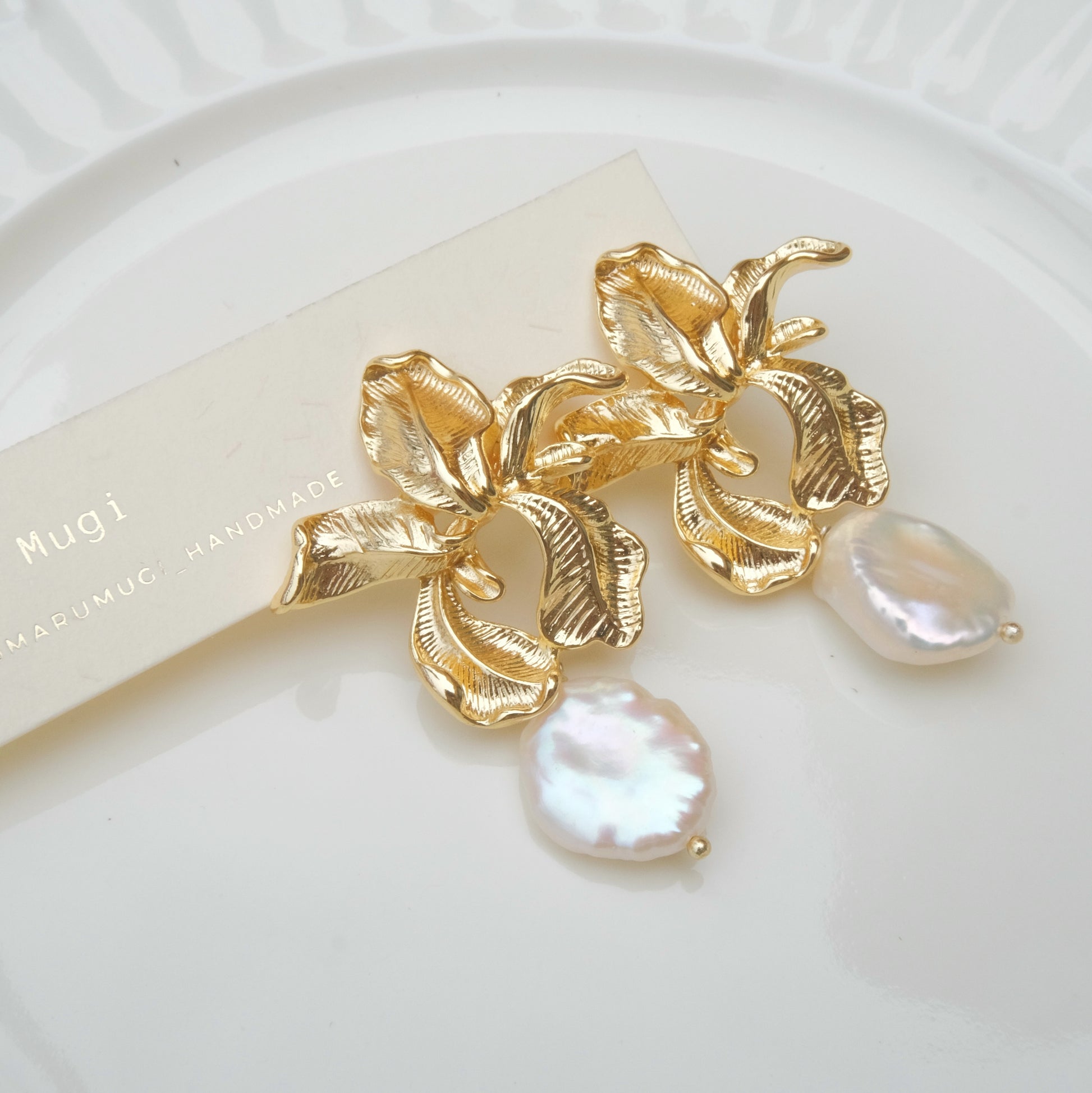 ✨ 金色のアイリスの花がこのピアスの主役 。