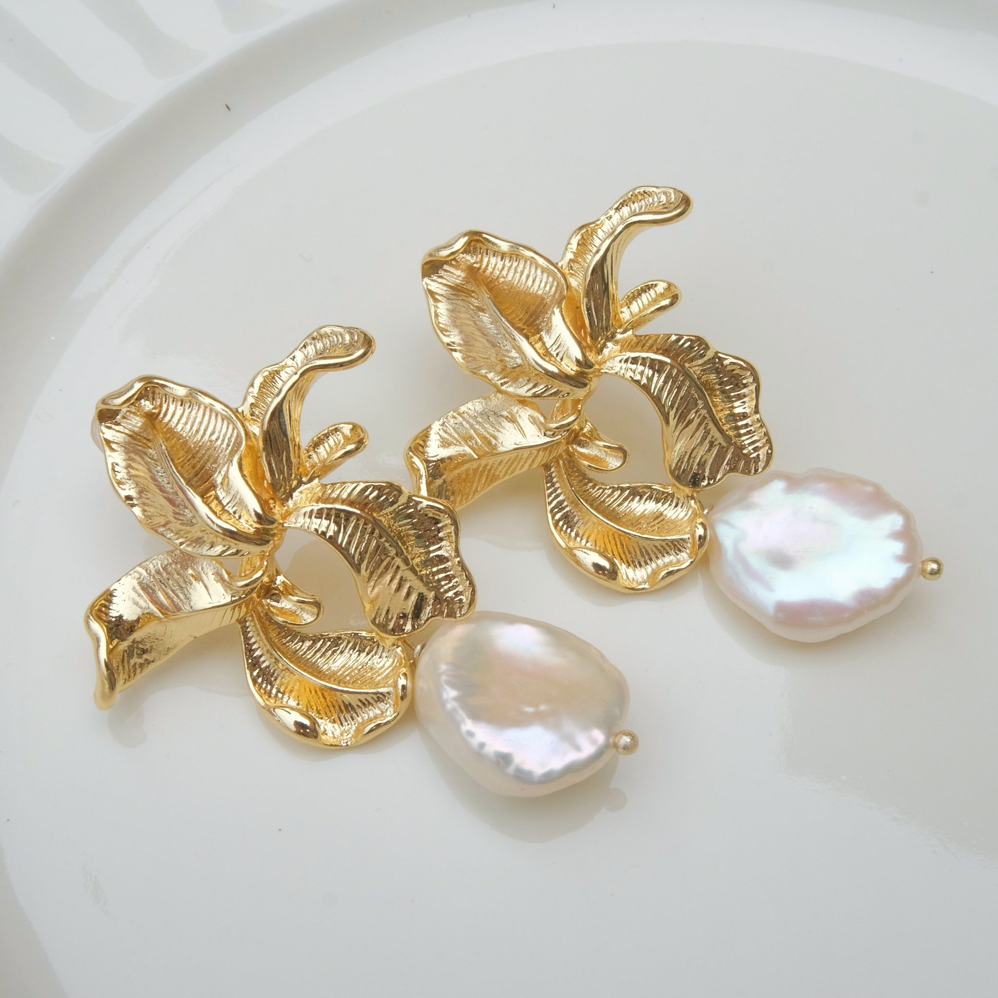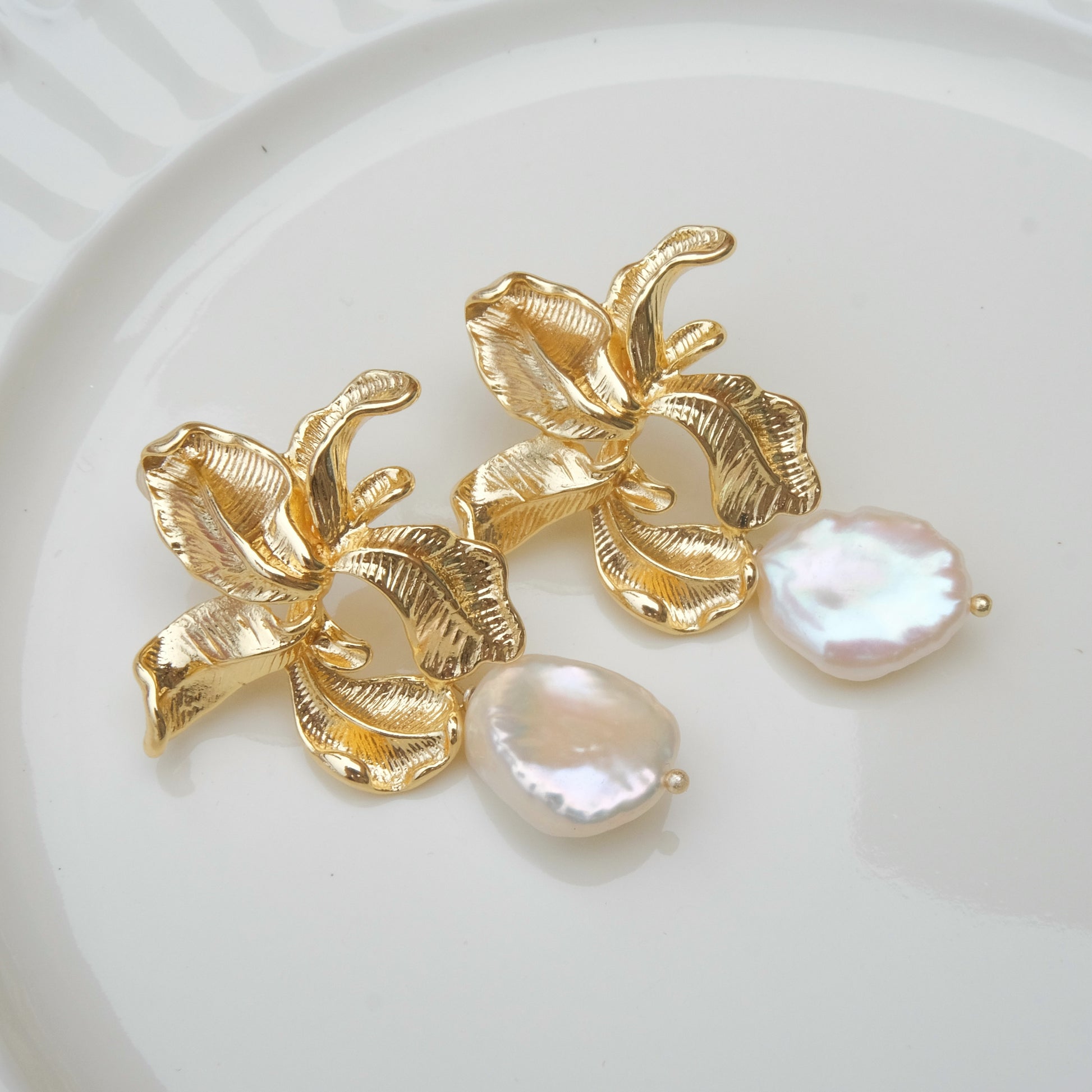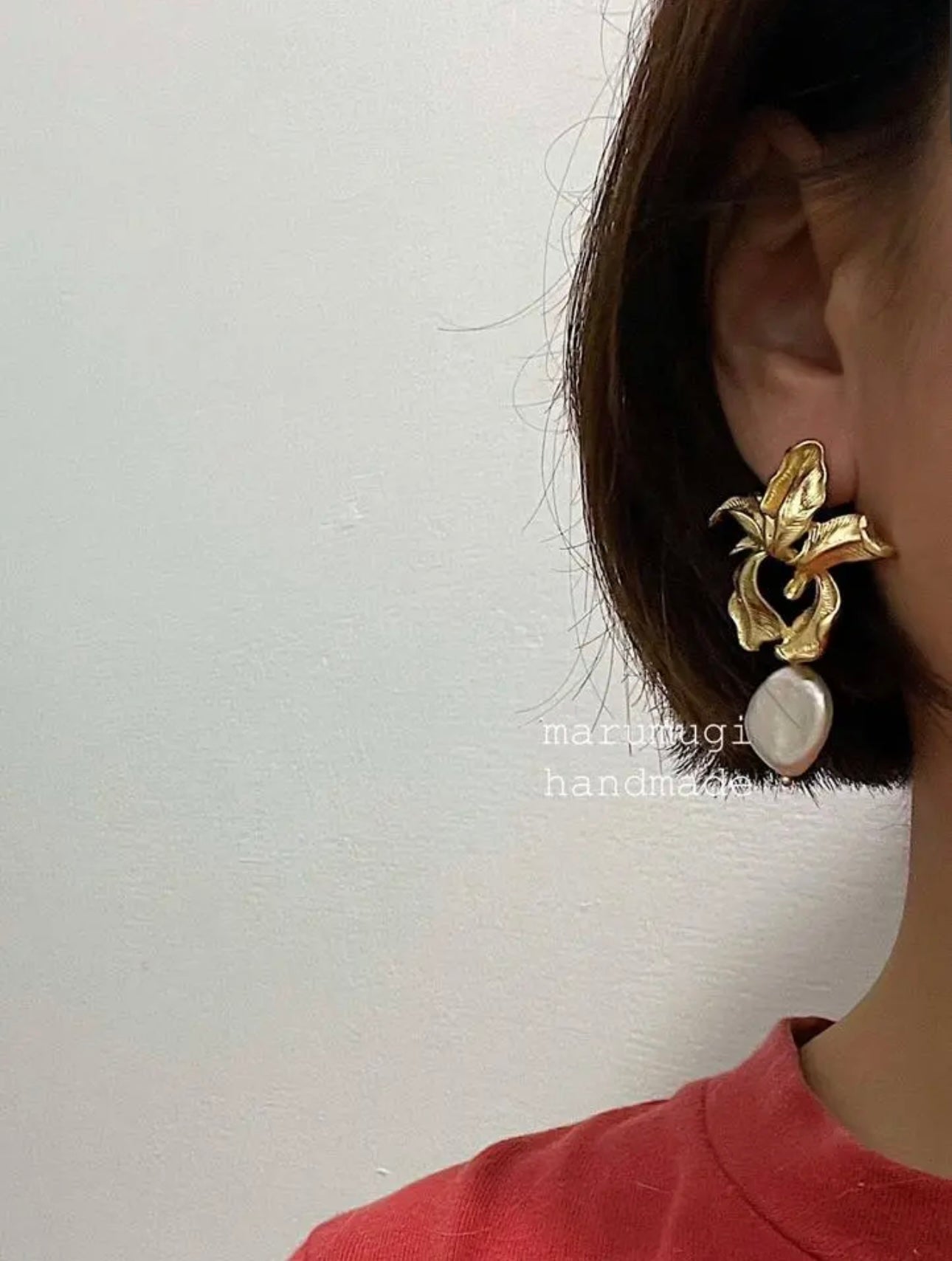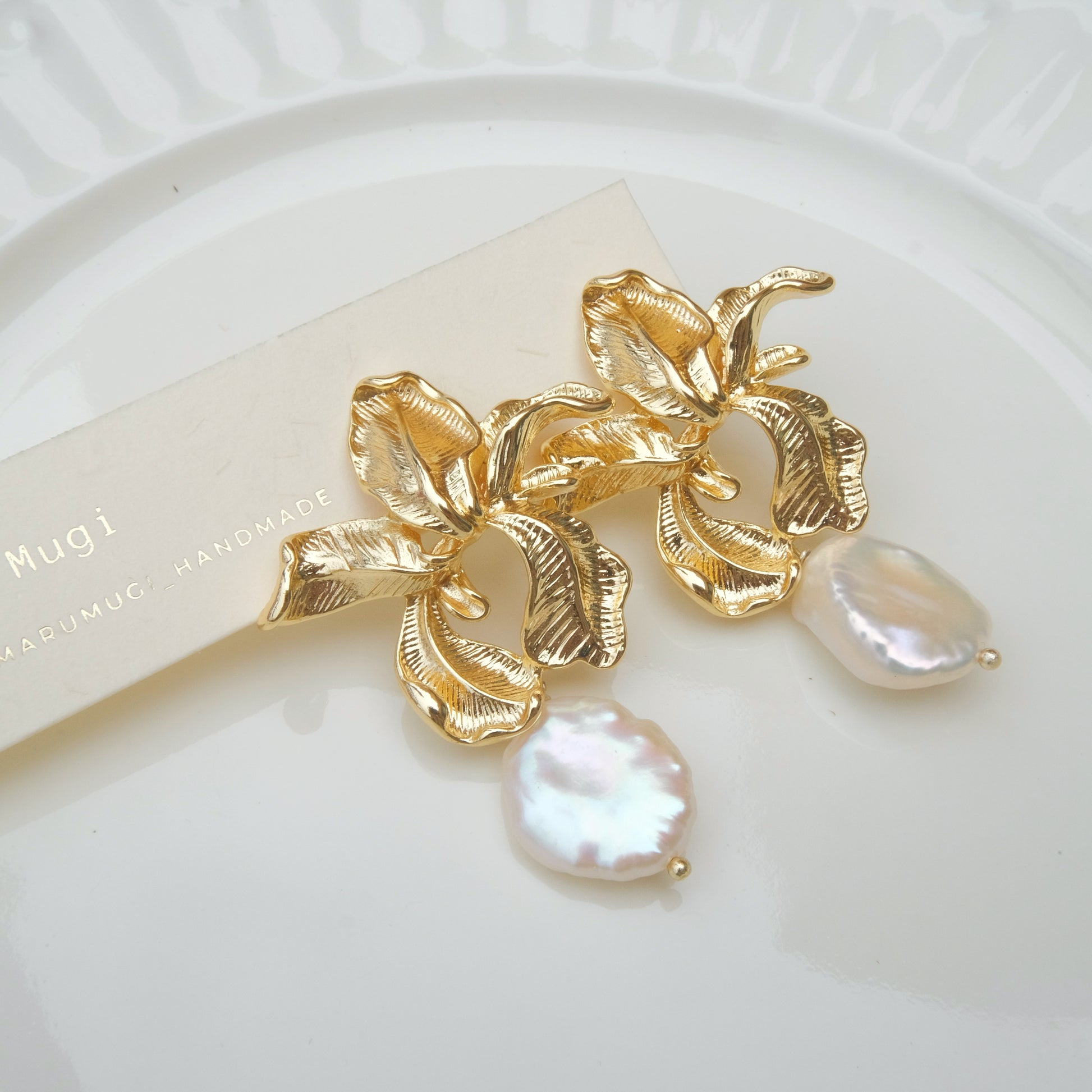 ✨ 金色のアイリスの花がこのピアスの主役 。